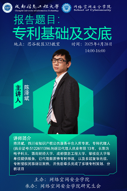 4月28日,四川省知识产权公共服务平台入库专家陈泽斌应邀为我院师生作《专利基础及交底》专题讲座。讲座在芯谷323会议室举行,由网络空间安全系主任彭承宗教授主持,讲座吸引了众多师生参与。