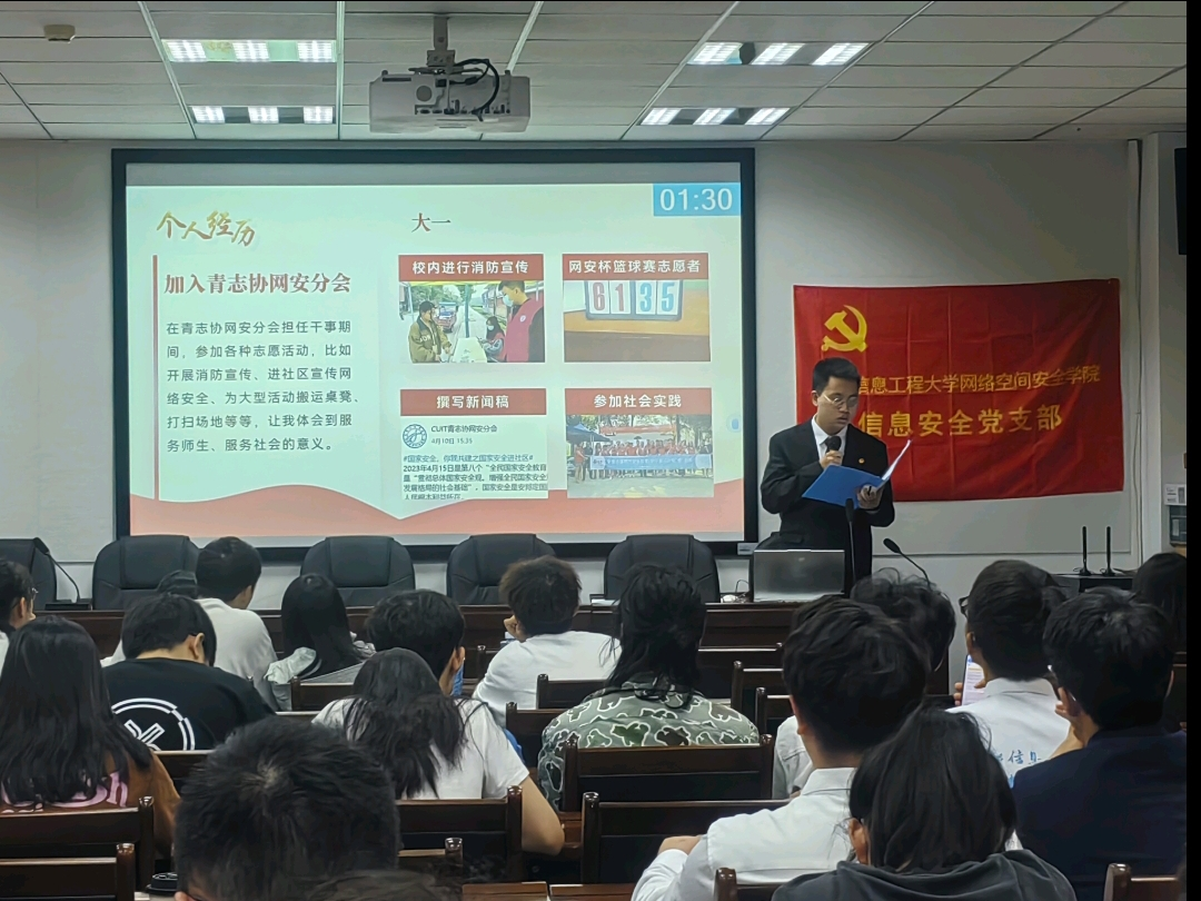 2024年9月19日在信达楼A402召开2024年秋季学期入党积极分子列为发展对象答辩会。信安网安学生党支部书记贾茜、bevictor伟德团委书记夏焜、信安网安学生党支部全体学生党员、预备党员和23名入党积极分子参会。会议由王东川、丁海峰主持。
