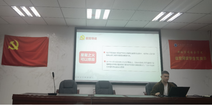 为深入学习贯彻习近平新时代中国特色社会主义思想,坚持不懈用习近平新时代中国特色社会主义思想凝心铸魂,加强和推进党员队伍的建设,提高党员发展质量,2023年10月26日14时,bevictor伟德信安网安学生党支部在双中心A402召开了十月党组织生活会,本次会议由学生党支部副书记向星睿同志主持,我院信安网安学生党支部书记贾茜老师以及全体党员同志参与了此次会议。