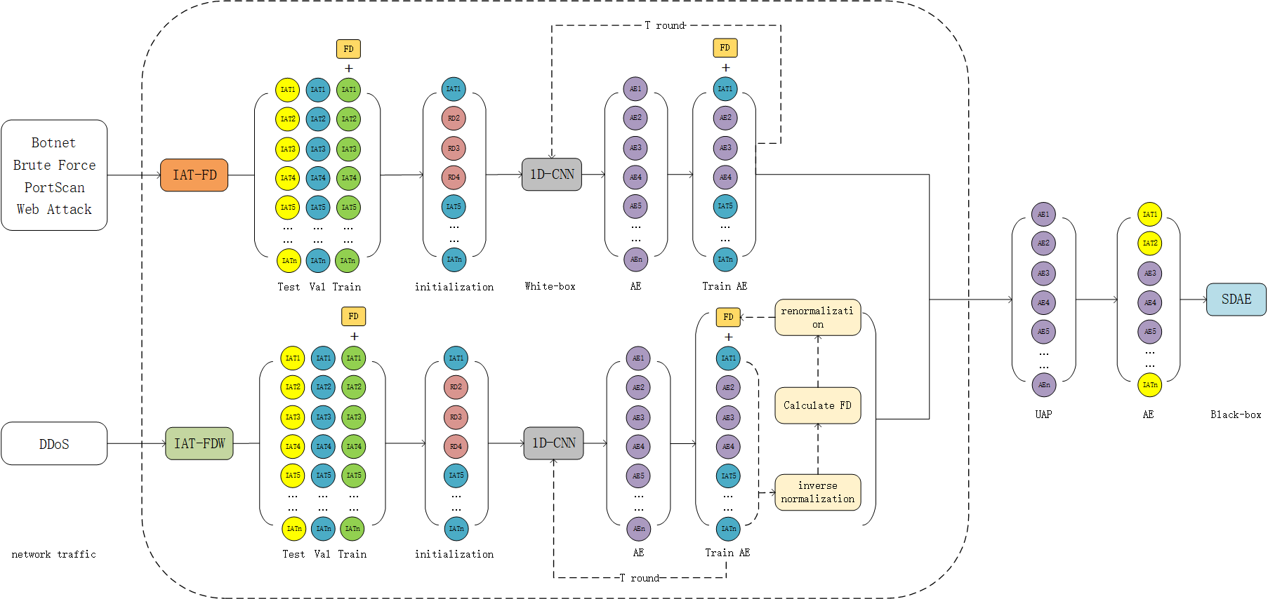 论文针对入侵检测鲁棒性问题,提出了一种基于时间序列特征的通用对抗性攻击框架。由白盒模型的梯度和损失来迭代生成对抗样本,然后针对不同流量类型应用不同的攻击方案,并将其保存为通用对抗扰动,最后向流中注入基于时间序列特征的扰动。实验对对抗样本生成模型进行评估,结果表明,所提出的方法不仅能使模型对僵尸网络、暴力破解、端口扫描和Web攻击四种恶意网络流量检测的准确率和召回率下降,同时还能使DDoS流量的检测性能下降。论文的方法利用极小的扰动将CNN白盒模型准确率下降72.76%,SDAE黑盒模型准确率下降78.77%。该论文为有效设计抵御对抗性攻击的人工智能模型奠定基础。