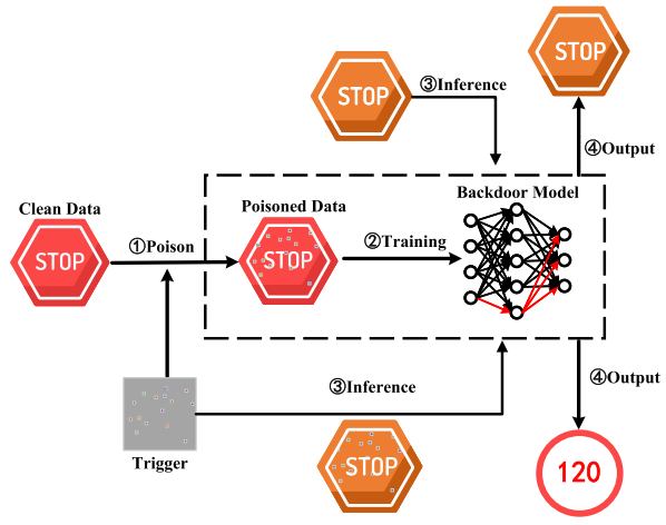 后门攻击是指攻击者在模型的训练过程中,以某种方式在训练数据中嵌入特定的触发模式(Trigger),使得模型在接收到这种触发模式时表现出特定的错误行为,而在其他情况下,模型仍然正常工作(图1)。这种新兴且发展迅速的现实世界攻击方法可能会导致严重的后果。