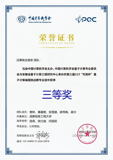 图1第三届CCF“司南杯”量子计算编程挑战赛专业组荣誉证书