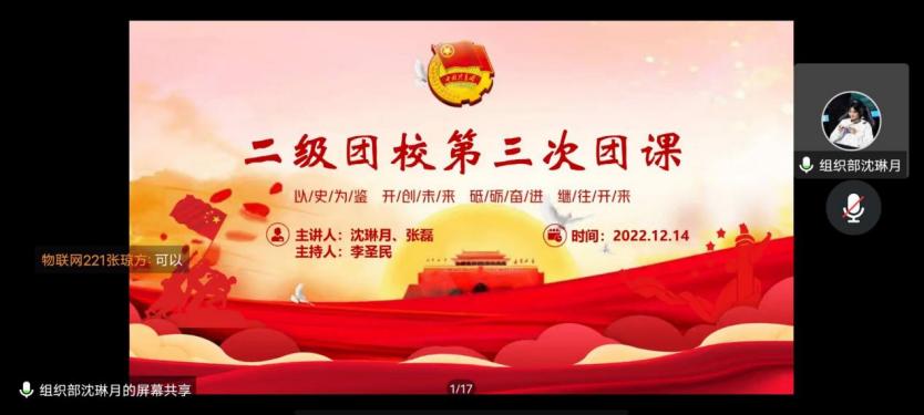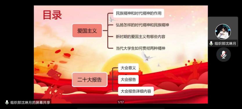 为进一步加强爱国教育,弘扬爱国主义精神,增强民族文化自信心与自豪感,强化对青年团员的思想政治引领,引导动员青年团员学习党的二十大精神,我院组织部于12月14日在线上开展了本次二级团校培训班的第三次团课。本次课程由组织部李圣民同学主持,内容上分为“爱国主义”和“深入学习贯彻党的二十大精神”两大板块,分别由组织部沈琳月同学和张磊同学讲解。