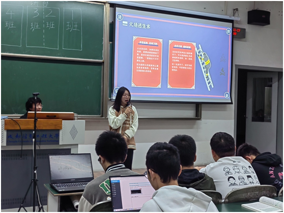 在本次活动中,信安221班班长王东川作为主讲人进行知识普及,她紧紧围绕消防安全活动主题,并结合《中华人民共和国消防法》,完善的讲解了火灾预防的基本概念和基本方法;分门别类的介绍了火灾的不同种类,着重讲解了消防工具的正确使用方法,并高度赞扬了新时代消防官兵的伟大贡献和不惧苦难的光辉精神。
