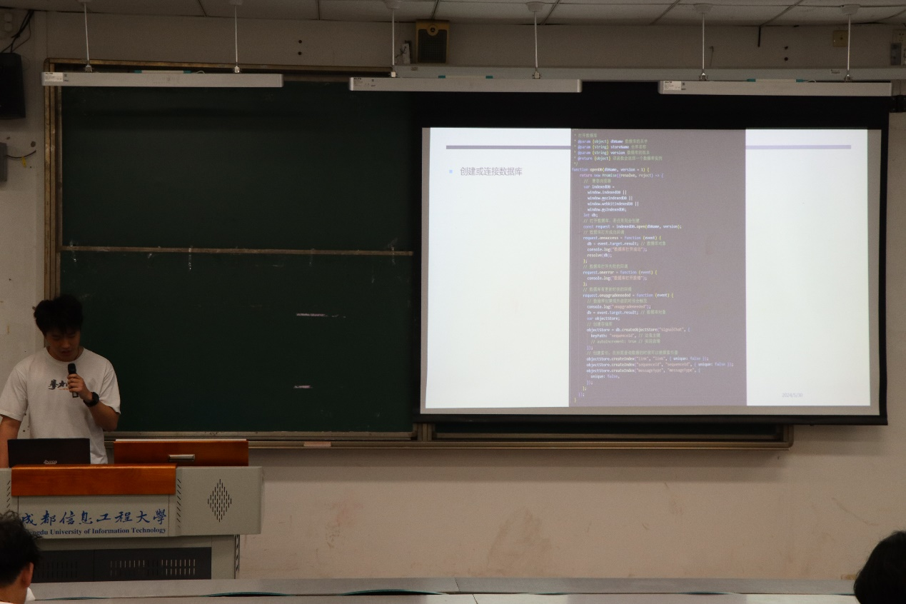 首先,由异步开发实验室成员邹锐对前端数据库进行介绍,为同学讲解了他对数据库理解和实践经验,并结合实际案例进行了演示。