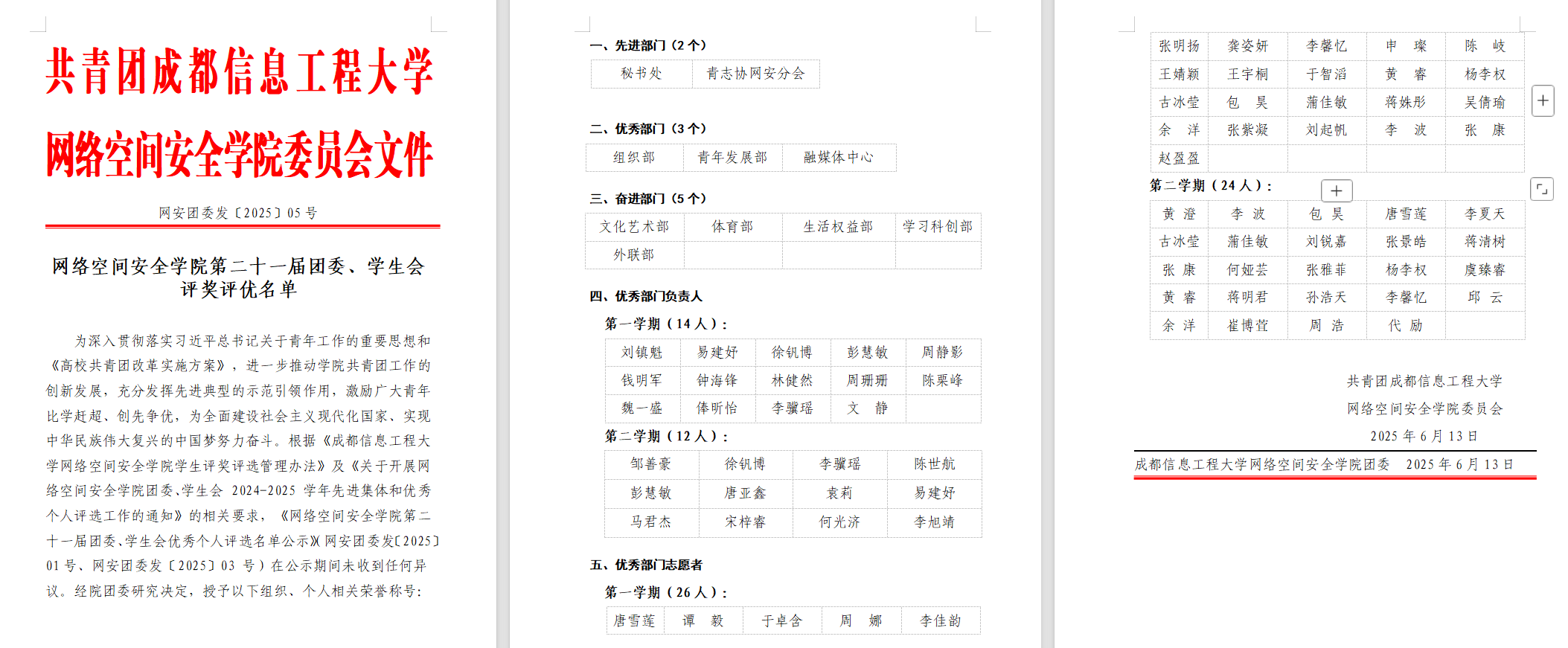 2025年6月12日下午,网络空间安全学院第二十一届团委、学生会先进集体评选大会在国际会议厅召开。学院团委书记夏焜、融媒体中心指导老师韩阳、校学生会主席廖俊、自动化学院团委副书记张恒、学院学生会副秘书长李骏轩及学院团委、学生会主席团成员出席会议。大会由学院团委秘书处陈世航主持。