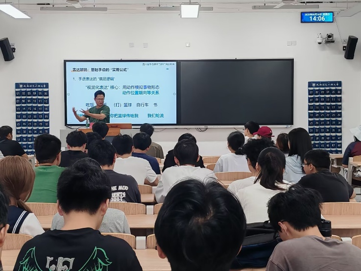 在第八届国际手语日(9月23日)即将到来之际,我院于9月18日成功举办了一场手语普及讲座。活动特邀四川省国家通用手语推广大使史宇明老师担任主讲,并由手语翻译秦佳老师全程协助讲解,为在场同学们带来了一场沉浸式的手语学习体验。